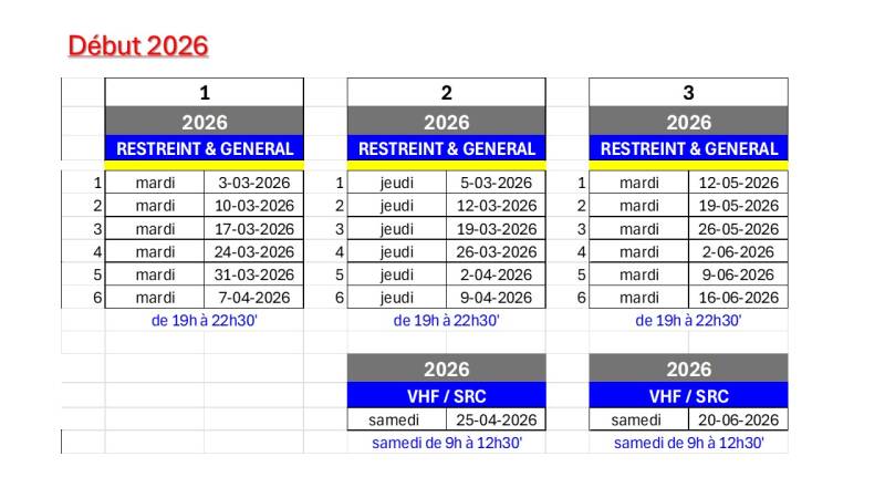 Pour rappel la formule All-In qui permet de présenter et d'obtenir le brevet général ou restreint, est programmé sur 6 soirées de 19h à 22h15' (+ une journée pratique comprise dans le prix).